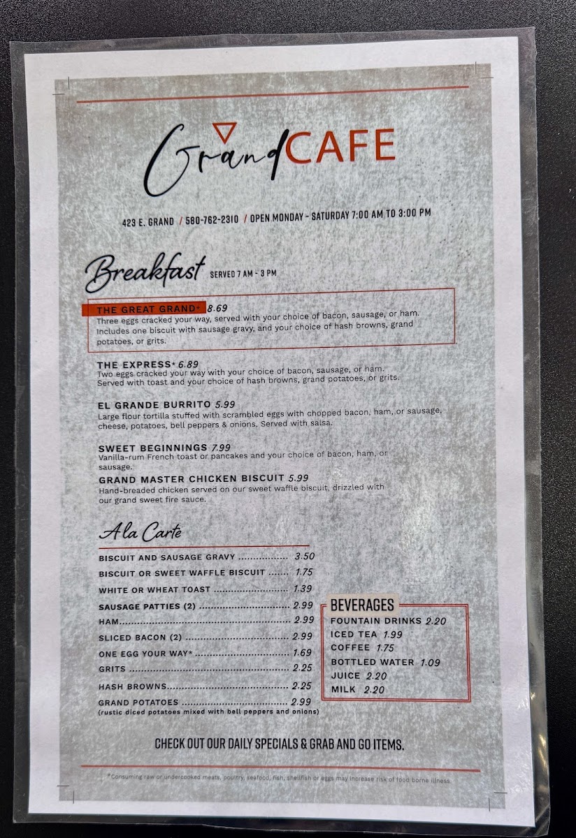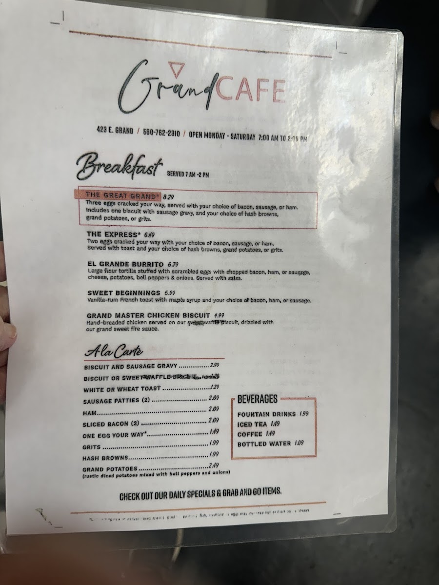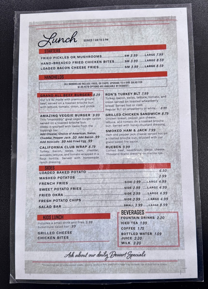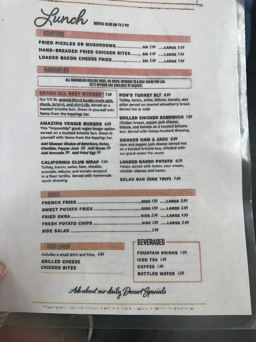 The Grand Cafe offers a diverse and satisfying menu that caters to various tastes and cravings. For breakfast, diners can enjoy hearty options like the Omelette, The Express, El Grande Burrito, and the indulgent Grand Master Chicken Biscuit. Sweet tooths are also in for a treat with the Sweet Beginnings. For those craving something light, the Delicious Duos combine a Sandwich & Salad or a Sandwich & Chips. The cafe’s Handhelds include the classic Grand All Beef Burger, the savory Smoked Ham & Jack, the deliciously loaded Philly Cheese Steak, and the ever-popular Reuben Sandwich. Starters like Mushrooms, Fried Pickles, and Loaded Bacon Cheese Fries add a great start to any meal. For something more filling, the Grand Meal Deal features options like Chicken Bites, Hamburger Patty, Grilled Chicken Breast, and Southern Fried Catfish. Kids can enjoy their own selection, with dishes like Chicken Bites and Grilled Cheese. Side options like Curly Fries, Sweet Potato Fries, and Fresh Potato Chips pair well with any meal. Beverage choices are equally varied, including Bottled Water, Coffee, Iced Tea, and Fountain Drinks. Whether you're stopping by for breakfast, a light snack, or a hearty meal, The Grand Cafe ensures a satisfying dining experience for all tastes and ages.